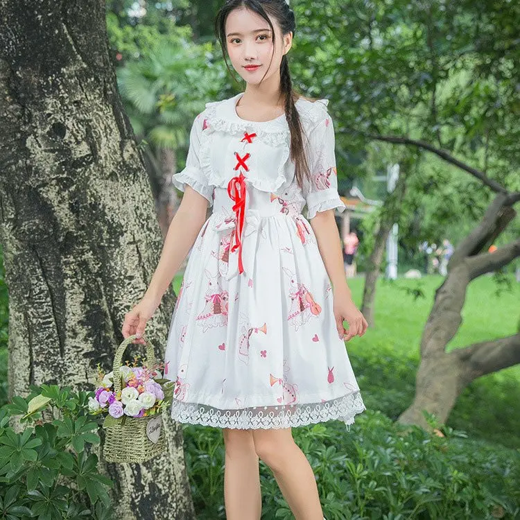 Japanese cute lolita retro musical instrument rabbit dress Costumes slort sleeve long sleeve red wh